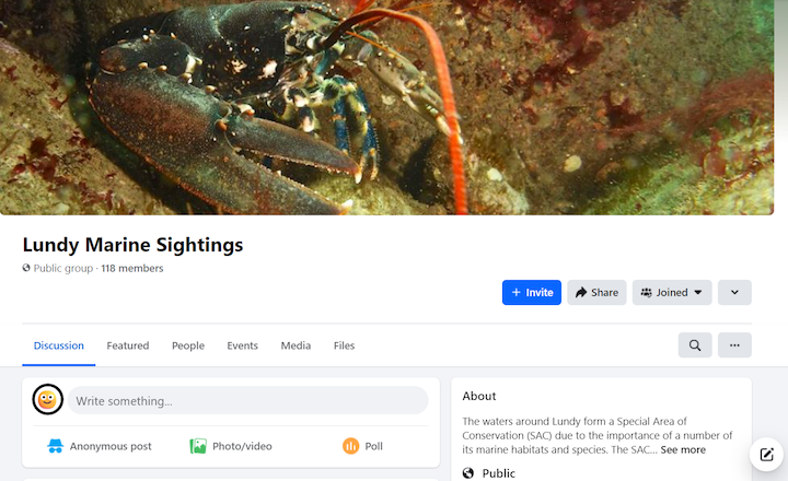 - Alternatively, if you aren't staying on the island, it would be great if you could put a post up on the Lundy Marine Sightings Facebook page (right). This could include a list of species seen that day, a collection of species photos (even if you aren’t sure what they are!) or just a post with a couple of sightings on it. We welcome any sightings that have been noted, no matter how common or boring you think they are!