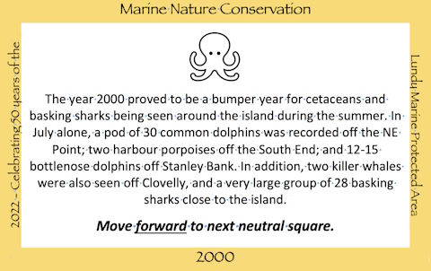 An incident & accident card from the Lundy MPA board game. See here for further information about the cards.If staying on the island, please log any sightings of cetacean species (detailing number seen, where, heading in which direction, date & time) in the wildlife log in the Tavern. For those not staying on the island, please notify the Warden of sightings (where these have been made within the MPA or on passage between Ilfracombe/Bideford and the island) via the upload link here, so that your record can be added to others on the island.