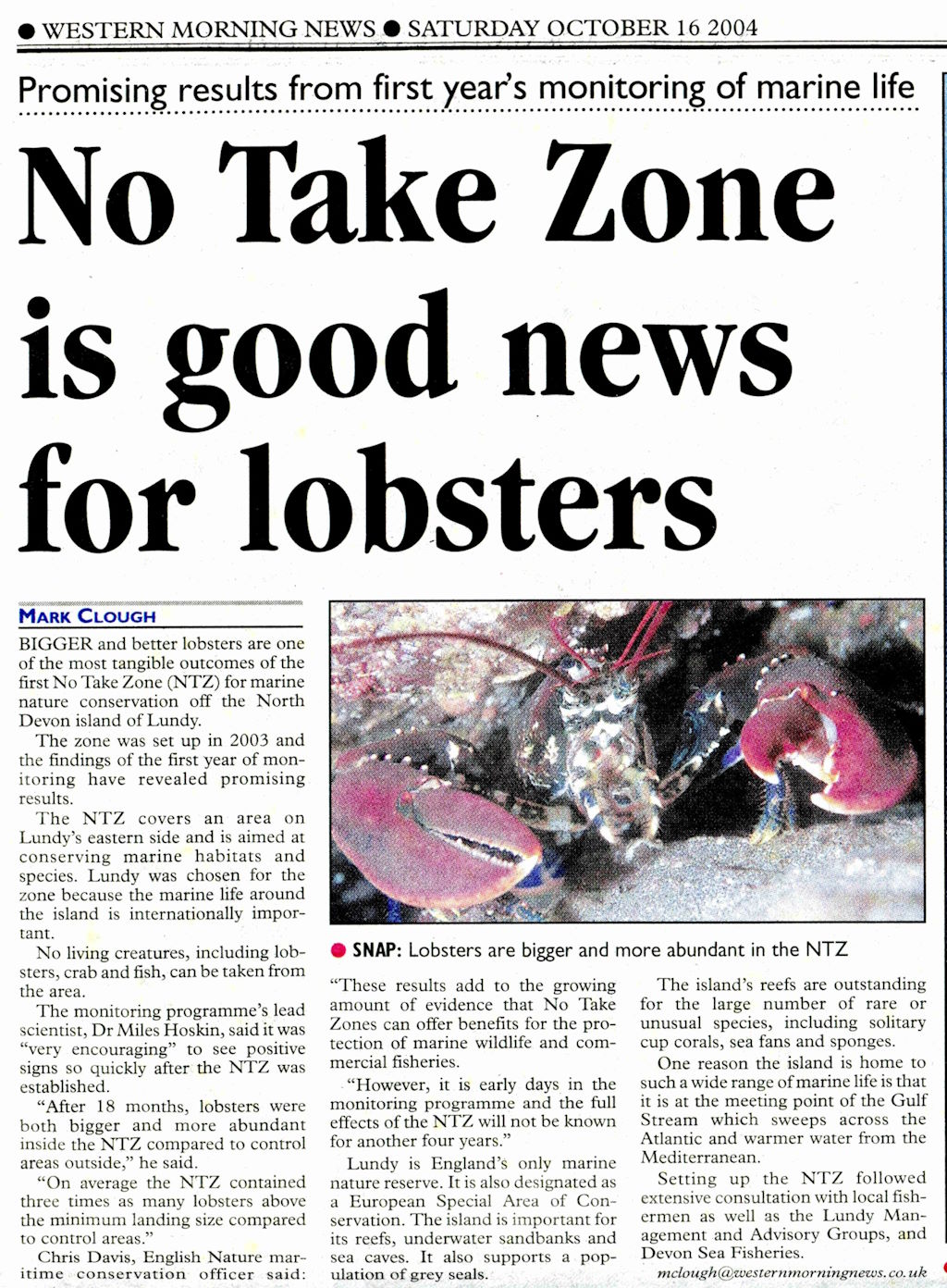 Western Morning News, 16th Oct. 2004First assessment of the No Take Zone