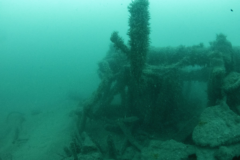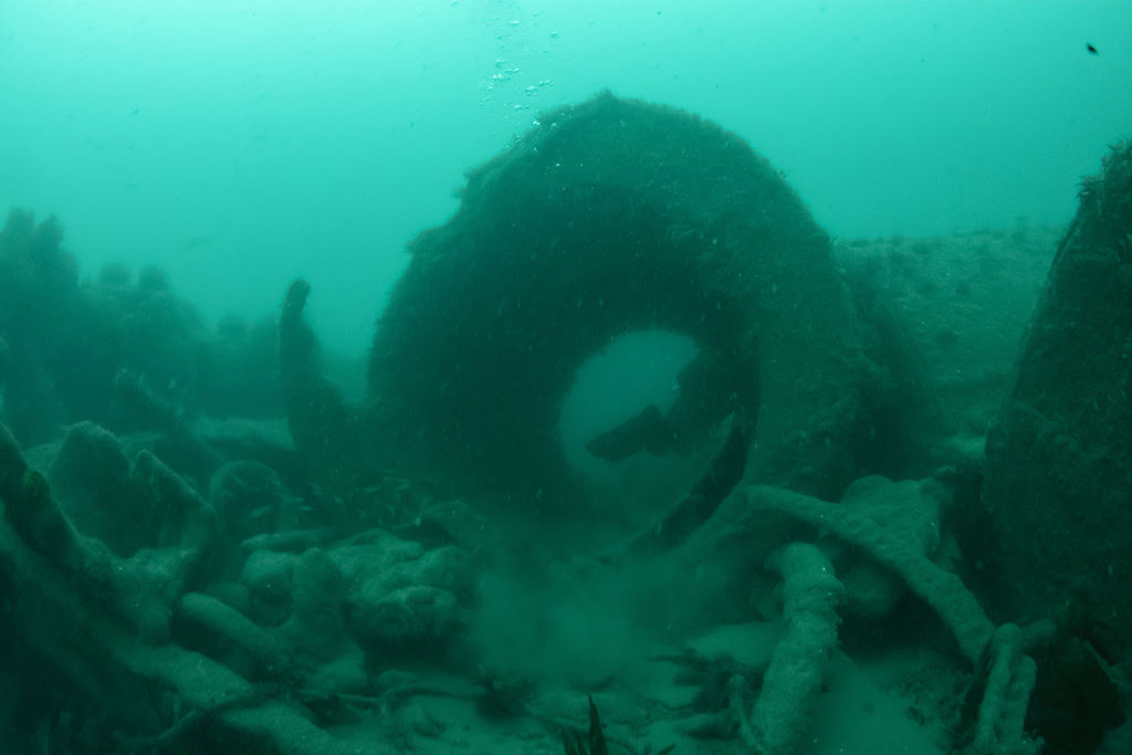Two of the distinguishing features of the Iona II, which were both major technical improvements in their day and which made the wreck worthy of special protection in 1989, are the paddle wheels and the engine. The paddle wheels were 20 ft in diameter and fitted with patent ‘feathering floats’. These allowed the angle of the blades to be adjusted which increased the wheel’s efficiency. The engine was known as an ‘oscillating engine’, an innovation which also made the engine more efficient in operation, allowing for a piston rod to connect directly with the paddle wheel crankshaft. A considerable amount of debris is present in the vicinity of the centrally-positioned engine and of the remains of the two paddlewheels either side of it.
