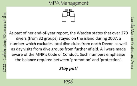 Overall management of the MPA at Lundy relies upon input from two main sources: a variety of ‘tools’ to assist in informing users of the MPA what is permissible and what is not; and a variety of people to oversee the conduct of the users of the MPA.